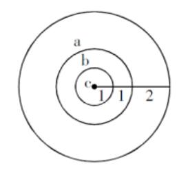 【答案】D。中公解析:总事件为将米粒投进圆圈内,A事件为小波周末不在家看书,视为点的米粒投进圆圈中的位置有无穷多个,也就是事件对应的样本数有无穷多个,并投掷在圆内的位置随机,故为几何概率问题。总事件的区域为圆圈总面积,A事件的区域为如图圆环b的面积。设小波投米粒的圆圈的半径为4,面积为16π。根据题意可知,圆环a表示他去看电影,小圆c表示他去打篮球,圆环b表示他在家看书,面积为4π-π=3π。则他周末不在家看书的概率为